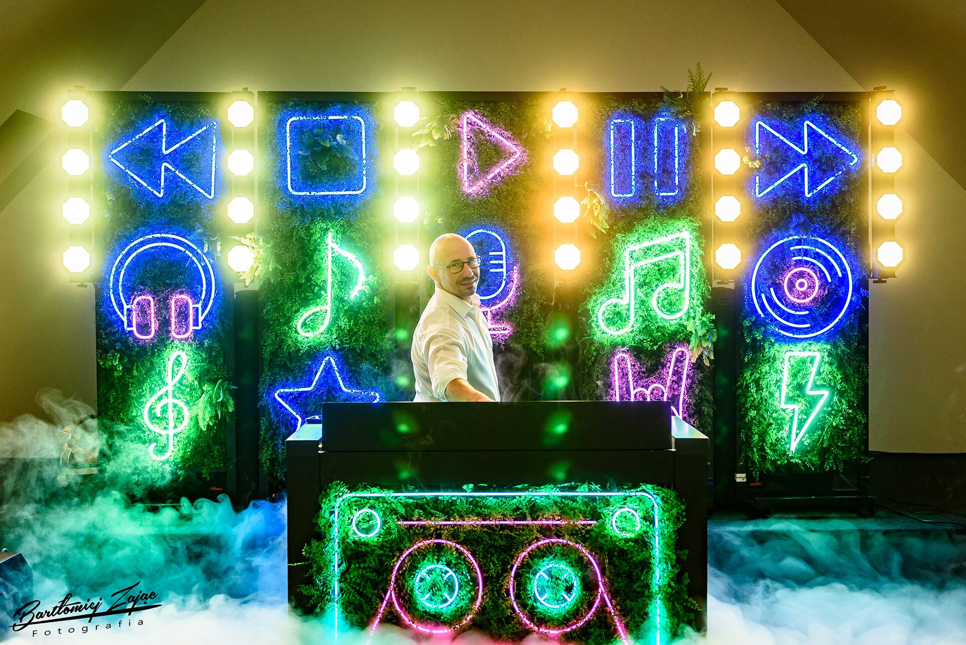Neonowe podświetlenie stanowiska DJ-a – pulsujące w rytmie największych hitów, nadające imprezie nowoczesnego i stylowego charakteru.